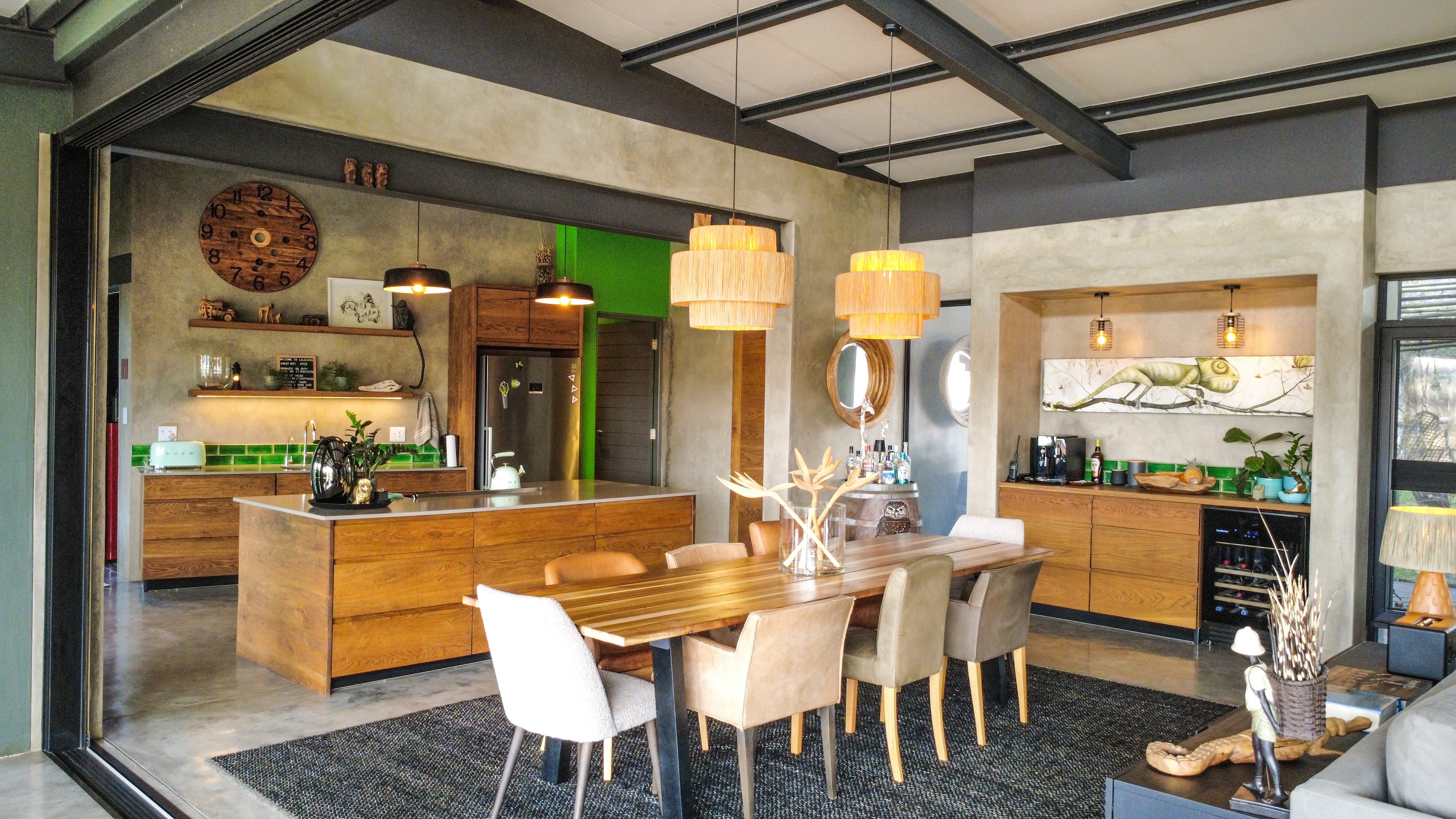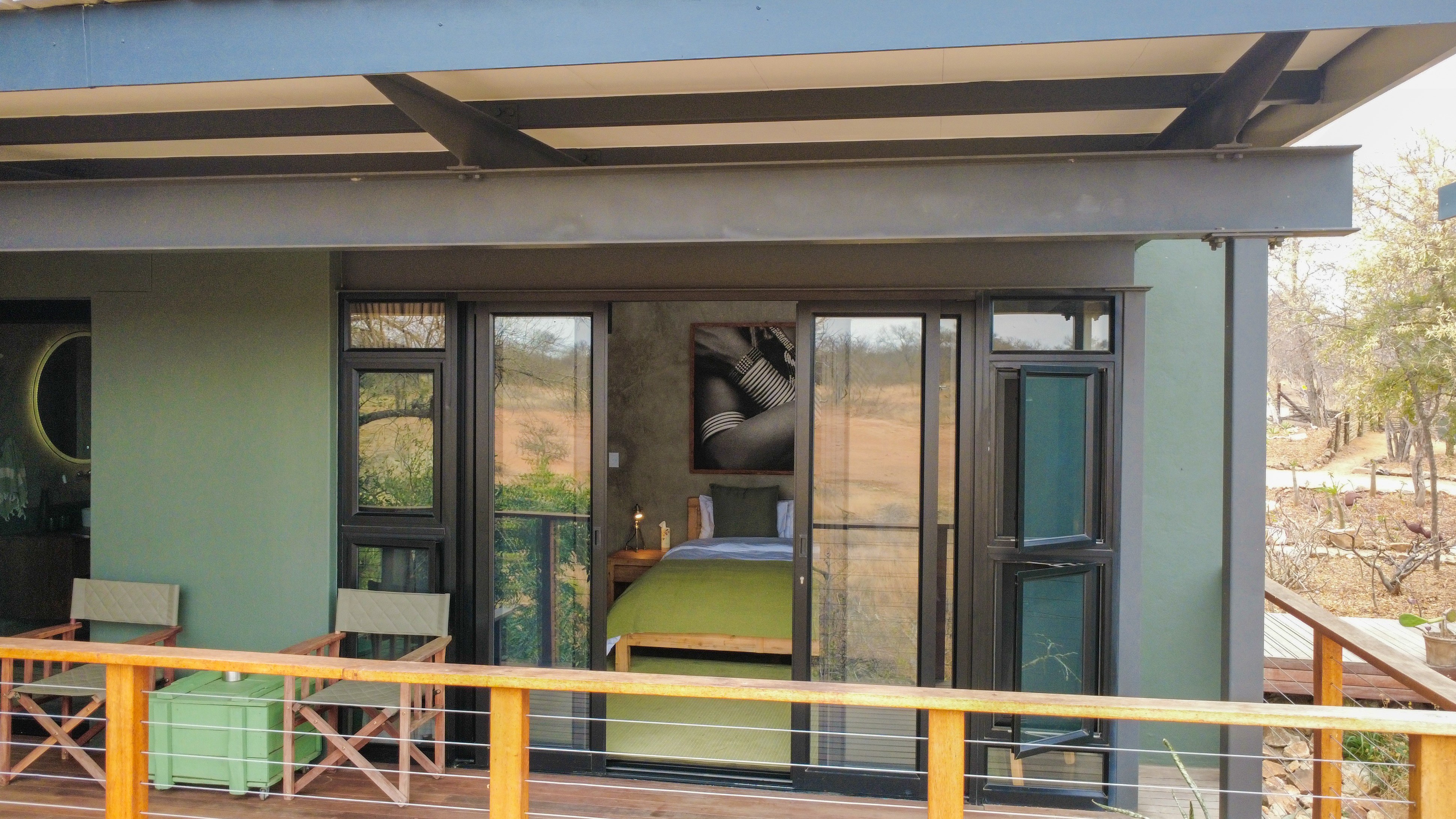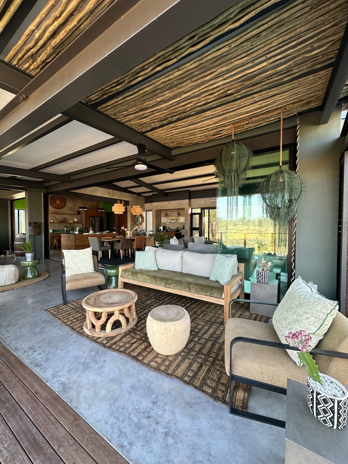 At La Laluka, elegance lies in simplicity. Concrete walls, wooden textures, and accents of green reflect the living landscape outside, creating a sanctuary that is both grounded and alive. This is a safari home where the beauty of the bush flows indoors, and life is lived at a gentler pace.