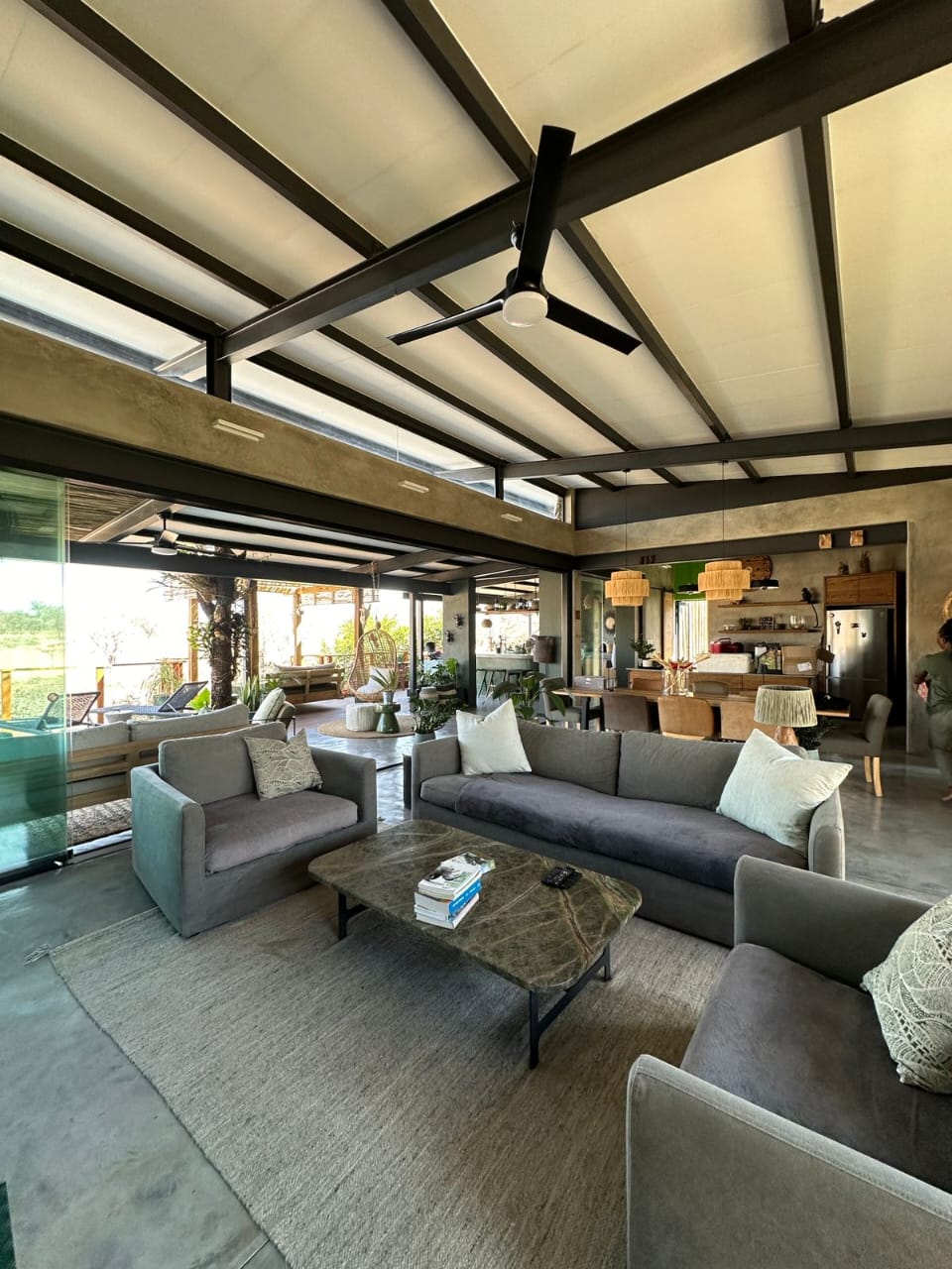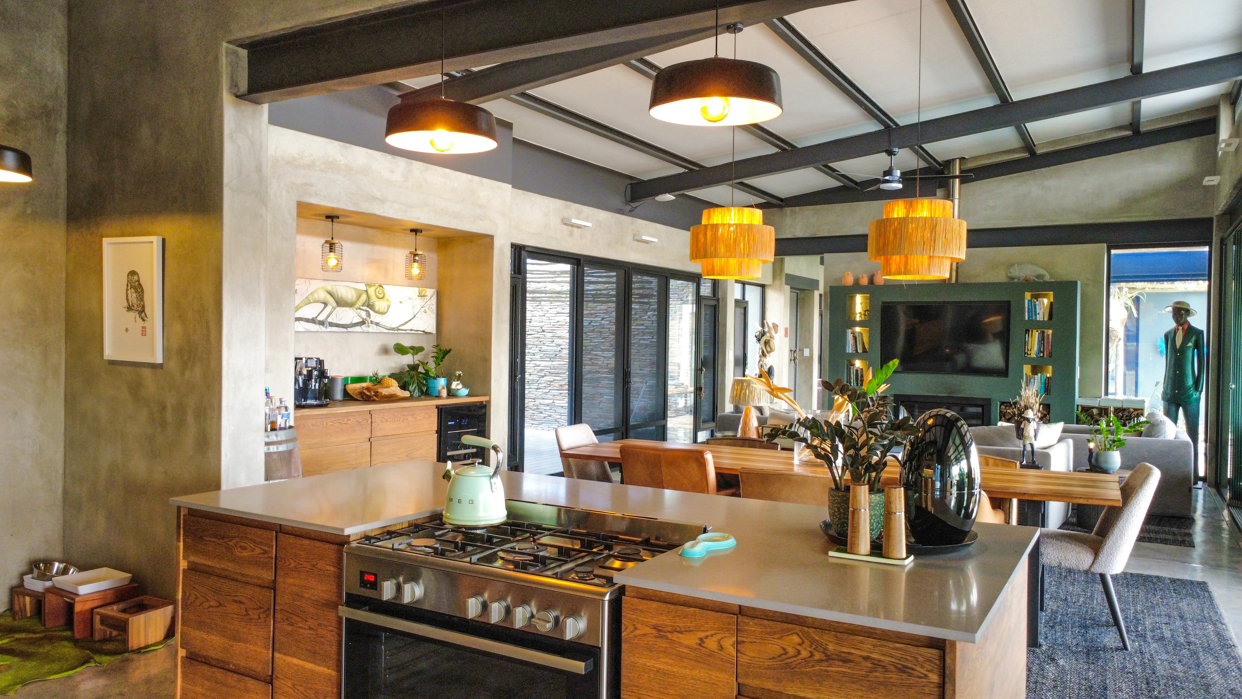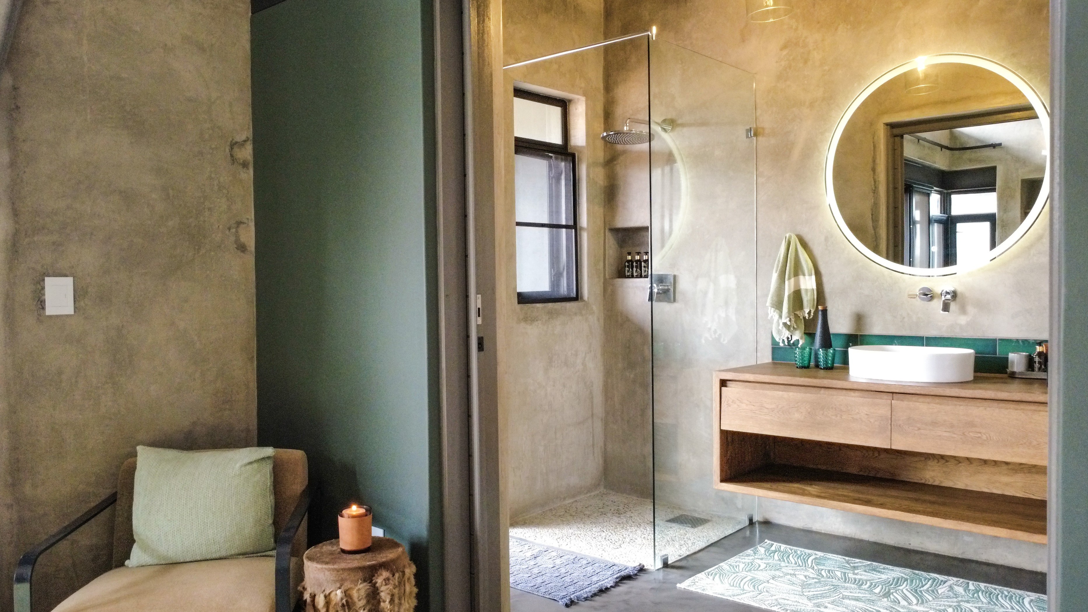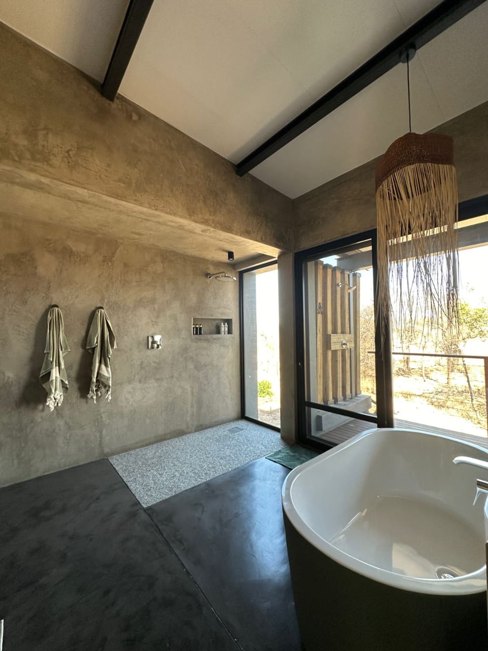 At La Laluka, elegance lies in simplicity. Concrete walls, wooden textures, and accents of green reflect the living landscape outside, creating a sanctuary that is both grounded and alive. This is a safari home where the beauty of the bush flows indoors, and life is lived at a gentler pace.